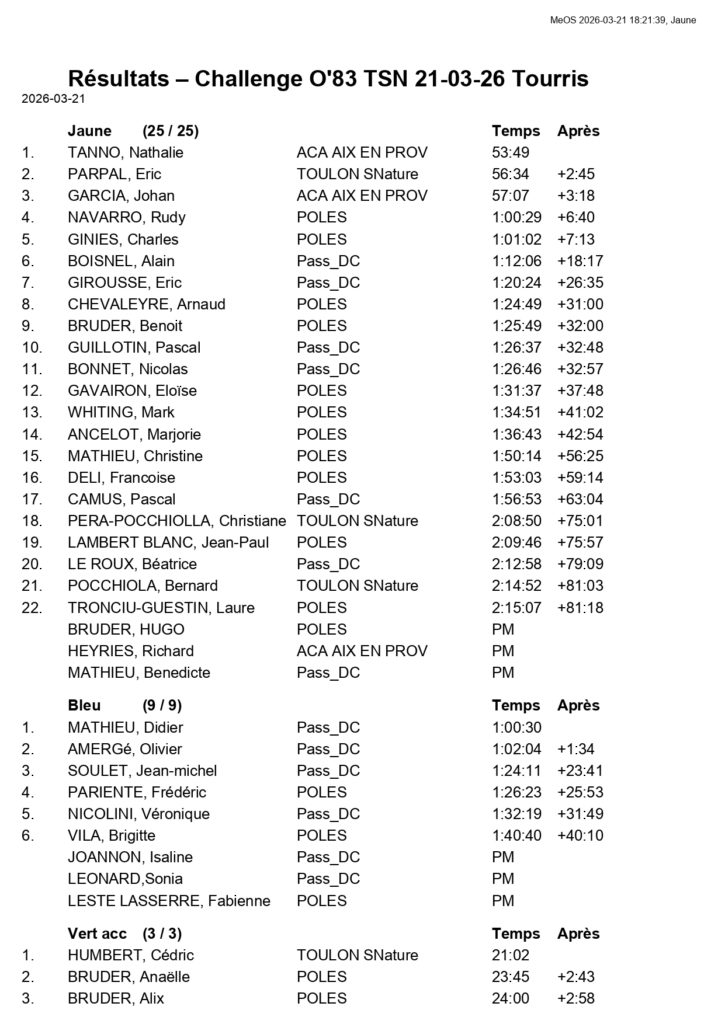 Voici les résultats du Challenge O’83 du 21 mars 2026 à Tourris organisé par Toulon Sport Nature